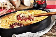 Costela gaúcha desfiada, mussarela, catupiry e batata palha.